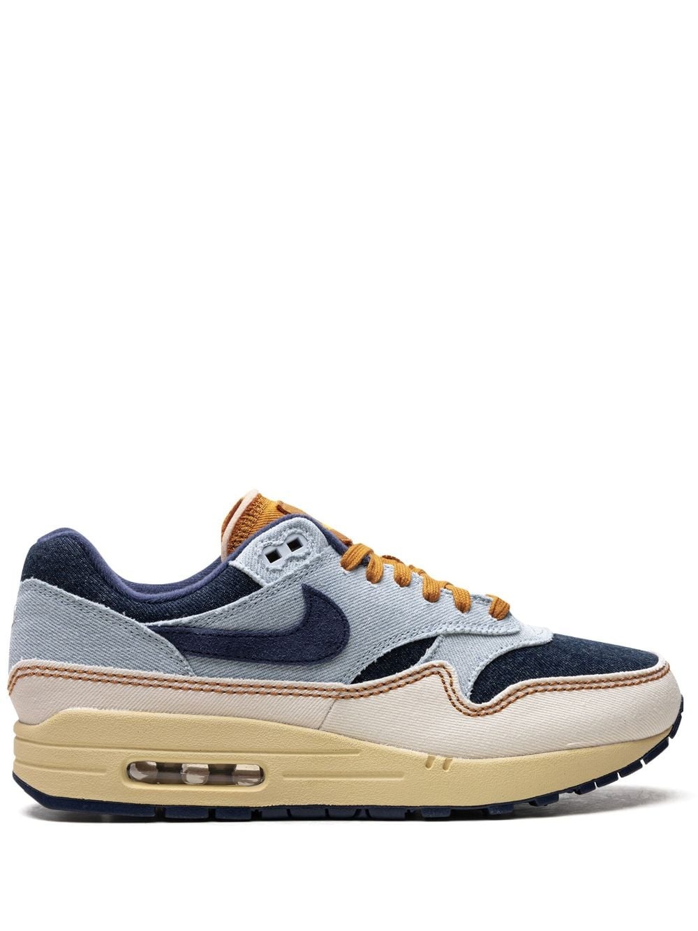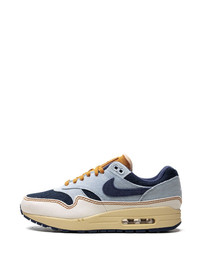 Air Max 1 '87 "Aura/Midnight Navy/Pale Ivory" sneakers The Nike Air Max 1 '87 boasts a unique design featuring denim-like panels that stretch from the toe box to the upper heel. The use of shades of orange adds a touch of vibrancy to the overall look, while the rubber sole ensures comfort. Highlights - Navy blue/light blue - Suede - Signature swoosh logo detail - Embroidered logo to the rear - Contrasting panel detail - Round toe - Front lace-up fastening - Logo patch at the tongue - Branded insole - Rubber sole with max air cushioning - These styles are supplied by a premium and authenticated sneaker marketplace. stocking only the most sought-after footwear, they source and curate some of the most hard to find sneakers from around the world. Imported Composition Suede 100% SIZE & FIT Measurement HEEL 1.77 in(4.5 cm) Sole height 0.59 in(1.5 cm)