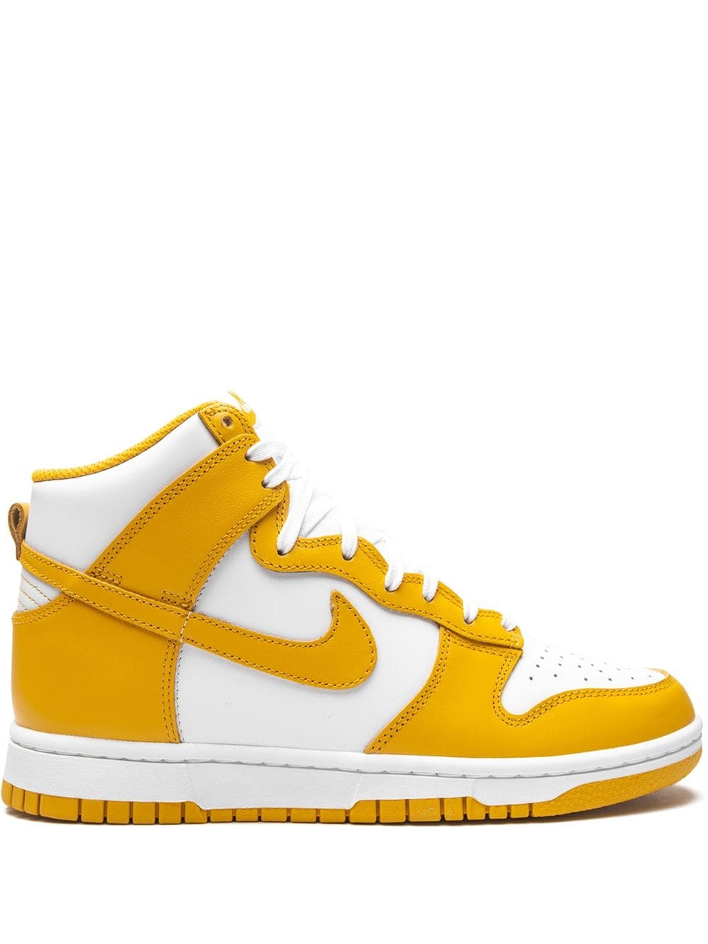 Dunk High "Dark Sulfur" sneakers Live in the sunshine with the new Nike Dunk High "Dark Sulfur" sneakers. In a high-top profile for added ankle support and stability, this pair is designed with one of the most beautiful colourways seen in a while for a cool yet bold touch. Highlights - Yellow/white - Leather/rubber - Signature swoosh logo detail - Contrasting panel detail - Perforated detailing - Round toe - Front lace-up fastening - Logo patch at the tongue - Ankle-length - Branded insole - Rubber sole - These styles are supplied by a premium sneaker marketplace. stocking only the most sought-after footwear, they source and curate some of the most hard to find sneakers from around the world. Imported Composition Leather 100% SIZE & FIT FittingInformation This piece fits small – take one size up Measurement HEEL 1.18 in(3 cm) Sole height 0.78 in(2 cm) HEIGHT 3.93 in(10 cm)