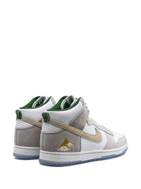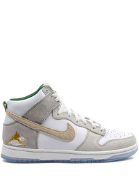 Dunk High Primium "Lunar New Year" sneakers Nike's iconic Dunk High sneakers return as a homage to San Francisco’s Chinatown and its encompassing culture and scenery. The leather and suede combined upper is adorned with the usual Swoosh logos on the sides with the addition of a gold-tone foil motif on the heels, symbolizing the city's commonly used nickname 'Gold Mountain'. Underneath, a white and icy blue rubber outsole offers enhanced traction. Highlights - White/light grey - Calf leather - Suede panelling - Signature swoosh logo detail - Round toe - Perforated toebox - Front lace-up fastening - Ankle-length - Flat rubber sole - These styles are supplied by a premium sneaker marketplace. stocking only the most sought-after footwear, they source and curate some of the most hard to find sneakers from around the world. Imported Composition Leather 100%