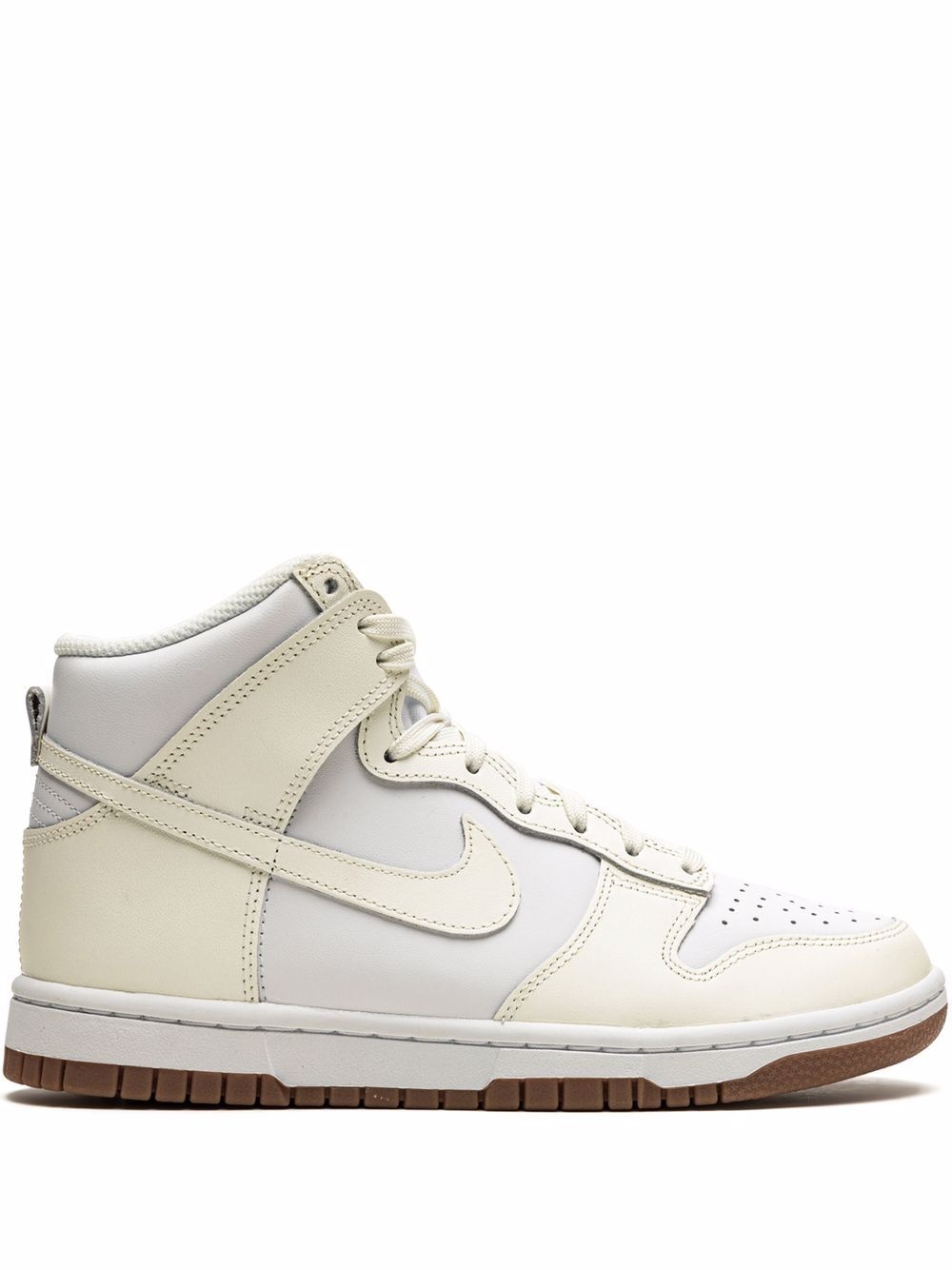 Dunk High "Sail/Gum" sneakers The Nike Dunk High now appears with a two-tone design - in white and sail-gum med brown. This high-top sneaker is crafted from leather and detailed with a Swoosh logo on the sides. The perforated details on the toe box provide breathability, while Zoom Air in the sockliner is included for cushioning. Underfoot, the usual rubber outsole offers traction. Highlights - White/sail-gum med brown - Leather - Signature swoosh logo detail - Two-tone design - Round toe - Front lace-up fastening - Logo patch at the tongue - Ankle-length - Branded insole - Rubber sole - These styles are supplied by a premium sneaker marketplace. stocking only the most sought-after footwear, they source and curate some of the most hard to find sneakers from around the world. Imported Composition Leather 100% SIZE & FIT FittingInformation This piece fits small – take one size up Measurement HEEL 1.18 in(3 cm) Sole height 0.78 in(2 cm) HEIGHT 3.93 in(10 cm)