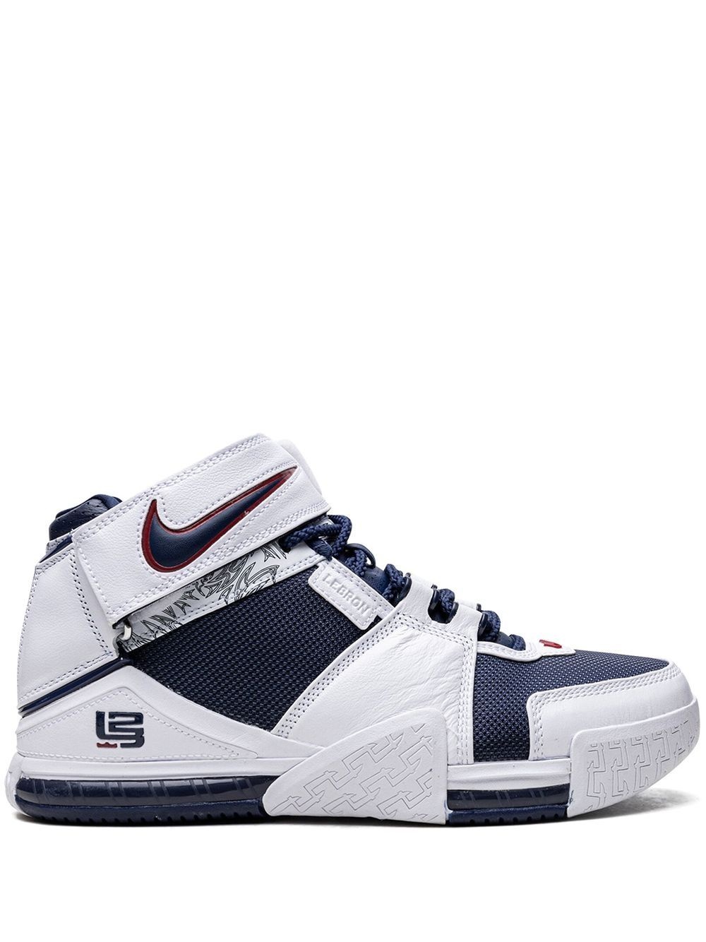 LeBron Zoom 2 "USA" sneakers Nike's LeBron Zoom 2 are a celebration of Lebron James' second run with the USA men's basketball team. This model features a high-top silhouette crafted from white leather and navy blue mesh panels and is finished with a touch strap and a padded collar that give ankle support. Highlights - Navy blue/white - Leather - Mesh panelling - Signature swoosh logo detail - Round toe - Front lace-up fastening - Ankle touch-strap fastening - Branded insole - Rubber sole - These styles are supplied by a premium sneaker marketplace. stocking only the most sought-after footwear, they source and curate some of the most hard to find sneakers from around the world. Imported Composition Leather 100%