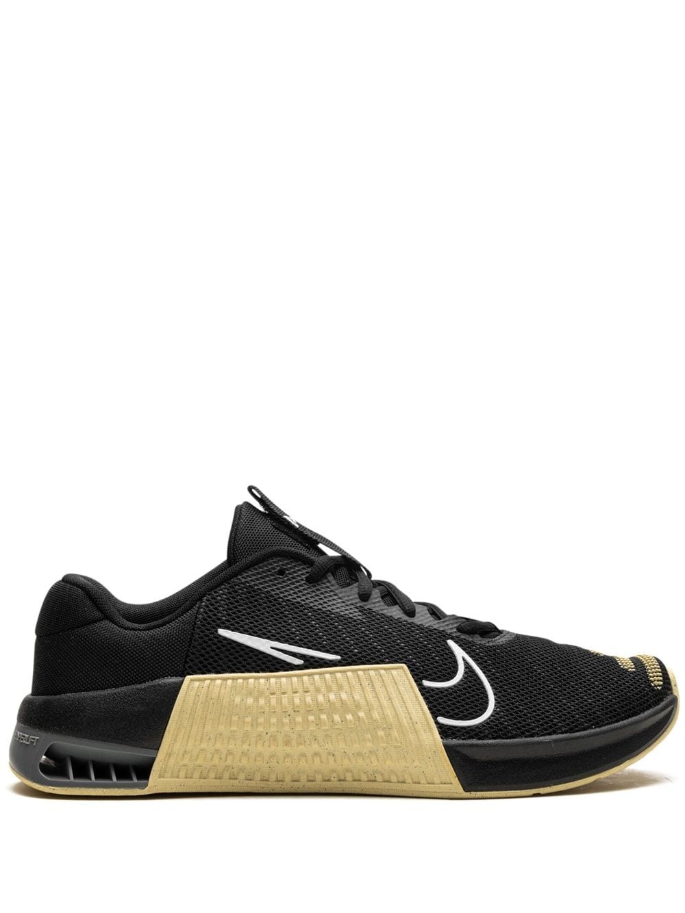 Metcon 9 TB "Vegas Gold" sneakers Highlights - Black/white/gold-tone - Front lace-up fastening - Signature swoosh logo detail - Pull-tab at the tongue - Round toe - Hyperlift plate - Rubber outsole - These styles are supplied by a premium and authenticated sneaker marketplace. stocking only the most sought-after footwear, they source and curate some of the most hard to find sneakers from around the world. Imported Composition Outer: Rubber 100%, Fabric 80%, Recycled Fabric 20% Lining: Fabric 100% Sole: Rubber 100%