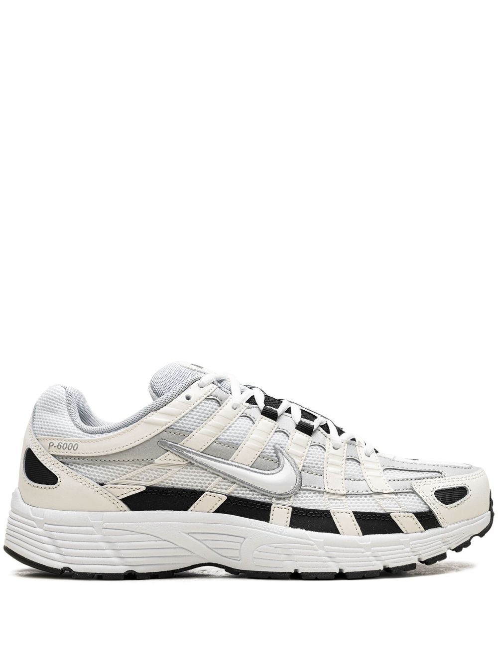 P-6000 "Sail" sneakers The Nike P-6000 'Sail” features a modern design with heavy inspiration from the 2000s era of running shoes. Constructed with a mesh upper with suede and leather overlays for a technical design, this sail, metallic silver and black makeover sits atop a rubber sole for comfort Highlights - Cream white/silver-tone/black - Calf leather - Mesh panelling - Signature swoosh logo detail - Round toe - Front lace-up fastening - Logo patch at the tongue - Branded insole - Rubber sole - These styles are supplied by a premium and authenticated sneaker marketplace. stocking only the most sought-after footwear, they source and curate some of the most hard to find sneakers from around the world. Imported Composition Sole: Rubber 100% Outer: Mesh 100%, Calf Leather 100%, Artificial Leather 100% Lining: Fabric 100% SIZE & FIT Measurement HEEL 1.79 in(4.5 cm) Sole height 0.98 in(2.5 cm) WIDTH 3.93 in(10 cm) HEIGHT 2.75 in(7 cm)