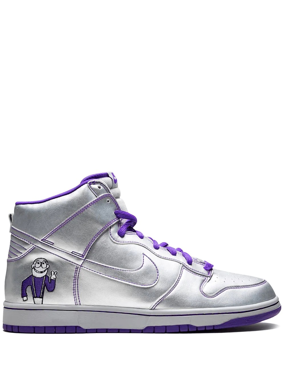 SB Dunk High Premium "Dinosaur Jr" sneakers Legend has it when man first stepped foot on the moon, it was in Nike Dunks. Most likely these metallic silver-tone leather Dunk High Premium SB sneakers from Nike, considering they come in an all-over metallic silver-tone leather colourway. Completely out of this world. Featuring a round toe, a flat rubber sole, a lace fastening, a signature Nike swoosh and a branded insole. Imported Composition Calf Leather 100%