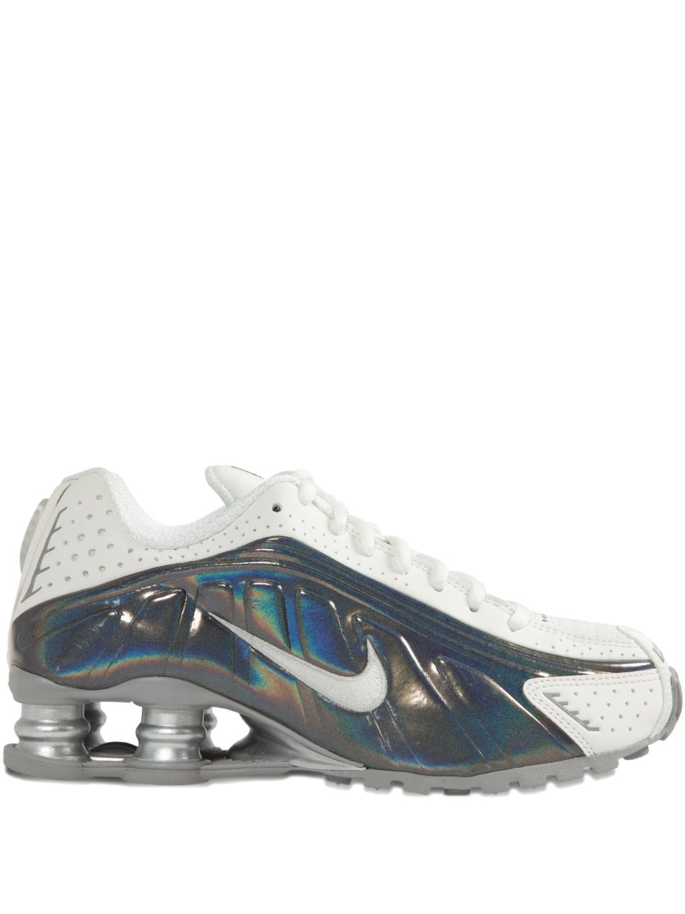 Shox R4 sneakers Highlights - Grey - Front lace-up fastening - Signature swoosh logo detail - Padded ankle - Round toe - Branded insole Imported Composition Outer: Fabric 100%, Polyurethane 100% Sole: Rubber 100% Lining: Fabric 100%