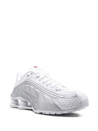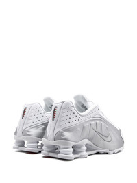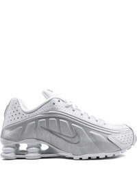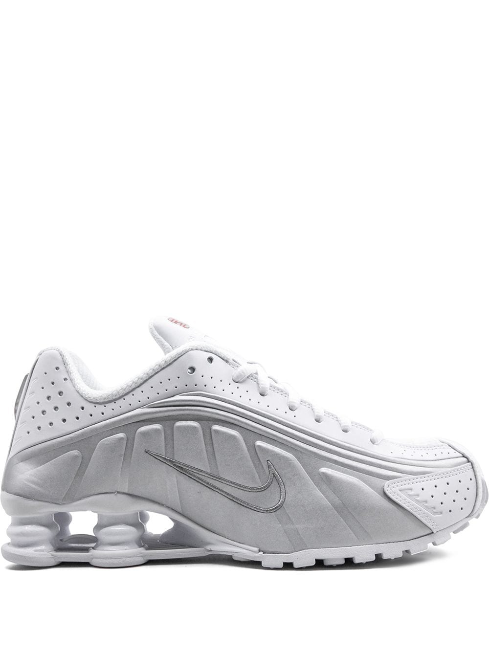 Shox R4 sneakers The Nike Shox R4 women's shoe is built with soft and durable synthetic and textile materials that bring forth a disruptive retro aesthetic, in a good way. The majority of the upper takes on a pristine combination of metallic silver and bright white. Perforations near the toe and around the ankle enhance breathability, and the four-pronged foam cushioning system and Pebax stability plate provide exceptional cushioning and unparalleled shock absorption. Finally, red accents the tongue, footbed, heel, and the bottom of the sole. Imported Composition Other fibres 100%