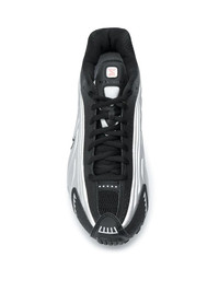 Shox R4 "Black/Metallic Silver" sneakers The Nike Shox R4 Shoe features the elite impact cushioning that's made the Nike Shox series famous, plus a synthetic upper for lightweight support. Featuring synthetic and textile upper for lightweight support, foam midsole with Nike Shox technology for a responsive, cushioned ride and durable tread for excellent traction. Made in Italy Composition Lining: Polyester 100% Outer: Calf Leather 100%, Polyester 100% Sole: Rubber 100% SIZE & FIT Measurement Sole height 0.39 in(1 cm) HEEL 1.96 in(5 cm)