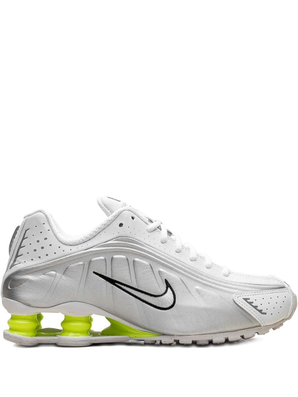 Shox R4 "White/Metallic Silver/Volt" sneakers Highlights - White - Front lace-up fastening - Panelled design - Perforated detailing - Signature swoosh logo detail - Logo-embroidered tongue - Round toe - Branded insole - Studded sole - These styles are supplied by a premium and authenticated sneaker marketplace. stocking only the most sought-after footwear, they source and curate some of the most hard to find sneakers from around the world. Imported Composition Outer: Artificial Leather 100%, Leather 100% Lining: Fabric 100% Sole: Rubber 100%