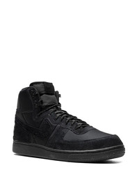 Terminator high-top "Hiking Boot - Triple Black" sneakers Nike's Terminator High "Hiking Boot - Triple Black" sneakers are a trail-inspired iteration of the retro basketball shoe. Metal eyelets and rope laces provide a hiking-boot-inspired feel. The iconic Swoosh logo completes the look. Highlights - Black - Calf leather - Suede panelling - Signature swoosh logo detail - Metal eyelet detailing - Round toe - Front lace-up fastening - Logo patch at the tongue - Ankle-length - Flat rubber sole - These styles are supplied by a premium sneaker marketplace. stocking only the most sought-after footwear, they source and curate some of the most hard to find sneakers from around the world. Imported Composition Leather 100%