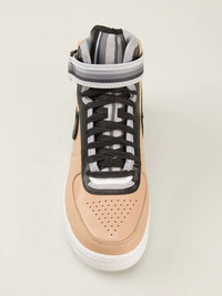 x Riccardo Tisci Air Force 1 Mid SP "Tan" sneakers Italian fashion designer Riccardo Tisci teamed up with Nike Sportswear in 2014 for a monumental collaborative collection on the Air Force 1 in low, mid, high, and an ultra-high boot edition for just for women. This unisex Air Force 1 Mid features a premium tan leather upper with the collection's signature striped trim in black, white, and grey for one of the most appealing looks of the entire high-fashion set. Imported Composition Calf Leather 100%, Rubber 100%