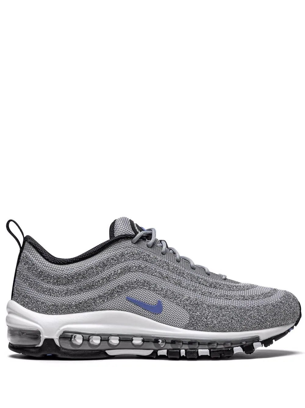 x Swarovski Air Max 97 "Polar Blue" sneakers The Swarovski x Nike Air Max 97 “Polar Blue” is a luxurious women’s exclusive version of the retro running shoe with a shiny finish. Here, the upper’s metallic silver leather panels shine from all angles while a 'Polar Blue' Swoosh appears on the midfoot and a black rubberized Air Max emblem graces the silver mesh tongue. True to the original styling of the Air Max 97, 'Air Max' text is printed on the nylon heel tab and a full-length visible Air unit appears beneath the white midsole. Highlights - Grey - Swarovski crystal - Signature swoosh logo detail - Round toe - Front lace-up fastening - Logo patch at the tongue - Pull-tab at the heel - Branded insole - Rubber sole - These styles are supplied by a premium sneaker marketplace. stocking only the most sought-after footwear, they source and curate some of the most hard to find sneakers from around the world. Imported Composition Outer: Polyester 100%, Swarovski Crystal 100% Lining: Polyester 100% Sole: Rubber 100%