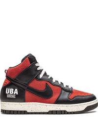 x Undercover Dunk High 1985 "Uba" sneakers The Undercover x Nike Dunk High 1985 "UBA" adds a Jun Takahashi’s interpretation of the retro shoe - designed for the fictional Undercover basketball league. Here, the upper blends crimson pebbled nubuck with contrasting overlays in smooth black leather. The lateral heel is marked with Undercover Basketball Association branding, while the opposite side is decorated with a logo hit. To finish the look, a modified rubber cup sole with off-white sidewalls is covered in speckled detailing. Imported Composition Leather 100% SIZE & FIT FittingInformation This piece fits small – take one size up