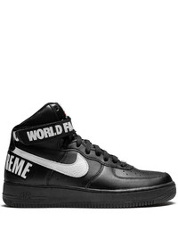 x Supreme Air Force 1 High SP "Black" sneakers Highlights - Black/white - Leather - Front touch-strap over lace-up fastening - Signature swoosh logo detail - Slogan print - Logo patch at the tongue - Round toe - Flat rubber sole - When buying this unisex item, keep in mind that it is graded in standard men's sizing. - These styles are supplied by a premium and authenticated sneaker marketplace. stocking only the most sought-after footwear, they source and curate some of the most hard to find sneakers from around the world. Imported Composition Lining: Calf Leather 100% Sole: Rubber 100% Outer: Calf Leather 100%