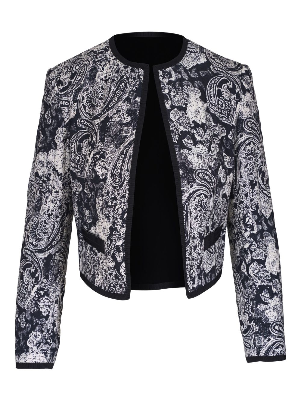 Bono jacket Highlights - Black - Open front - Two front jetted pockets - Paisley print - Collarless Imported Composition Outer: Viscose 100% Lining: Cotton 100%