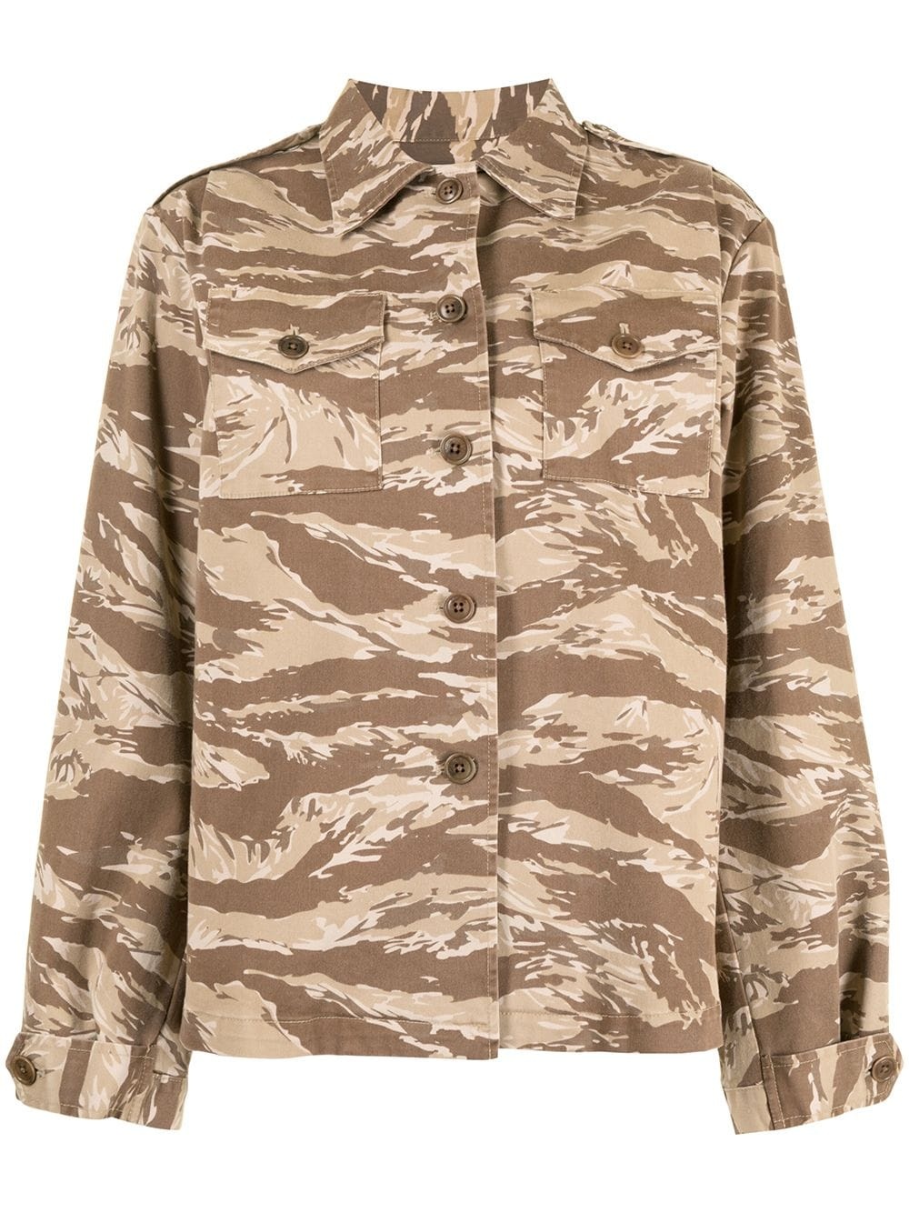 camouflage print shirt brown cotton camouflage print classic collar front button fastening long sleeves buttoned cuffs two chest patch pockets straight hem Made in Italy Composition Cotton 100% SIZE & FIT Model measurements Height 5 ft 9 in(1.76 m) Bust/Chest 29.13 in(74 cm) Hips 33.07 in(84 cm) Waist 22.83 in(58 cm) FittingInformation This piece fits true to size. We recommend you get your regular size Cut for a loose fit Made with a mid-weight stretch fabric Washing instructions Dry Clean Only
