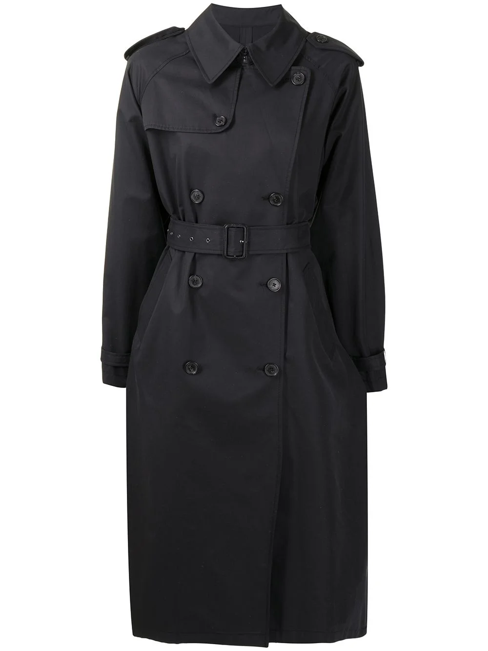 double breasted trench coats black cotton blend notched lapels double-breasted button fastening long sleeves buttoned cuffs belted waist central rear vent mid-length Made in Italy Composition Outer: Cotton 64%, Nylon 36% Washing instructions Dry Clean Only