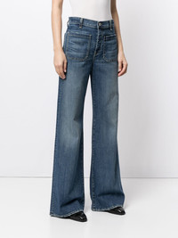 mid-rise wide-leg trousers blue cotton blend mid wash mid-rise belt loops front button and zip fastening two front patch pockets two rear patch pockets wide leg floor-length Made in United States Composition Cotton 98%, Polyurethane 2% SIZE & FIT Model measurements Height 5 ft 9 in(1.76 m) Bust/Chest 29.13 in(74 cm) Hips 33.07 in(84 cm) Waist 22.83 in(58 cm) Measurement FRONT RISE 10.62 in(27 cm) INSIDE LEG 34.64 in(88 cm) HIPS 35.03 in(89 cm) FittingInformation This piece fits true to size. We recommend you get your regular size Designed to be fitted at the waist, loose over the leg Made with a mid-weight fabric Washing instructions Machine Wash