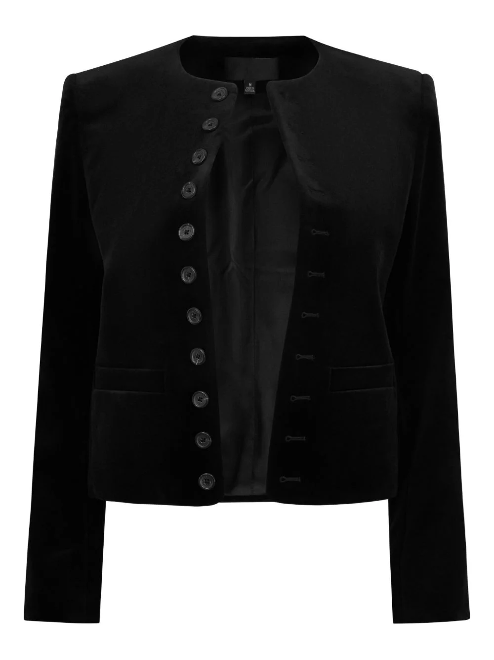 Patti buttoned short jacket Highlights - Black - Front button fastening - Front welt pockets - Long sleeves - Round neck - Straight hem Imported Composition Cotton 98%, Elastane 2% Washing instructions Dry Clean Only