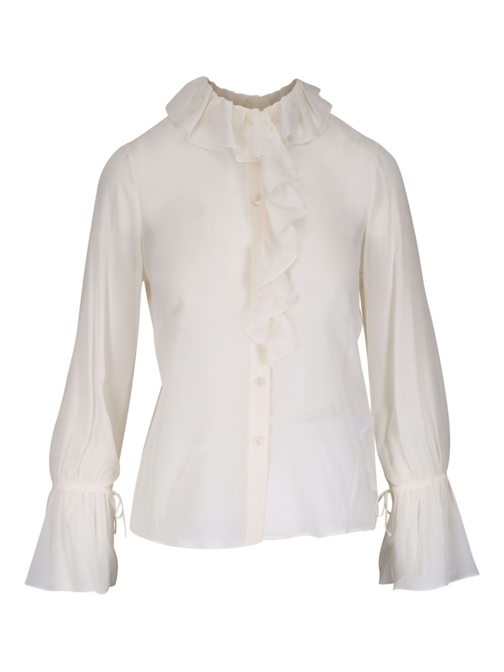 ruffle-detail blouse Highlights - White - Front button fastening - Drawstring cuffs - Ruffle collar - Long sleeves Made in United States Composition Silk 100%