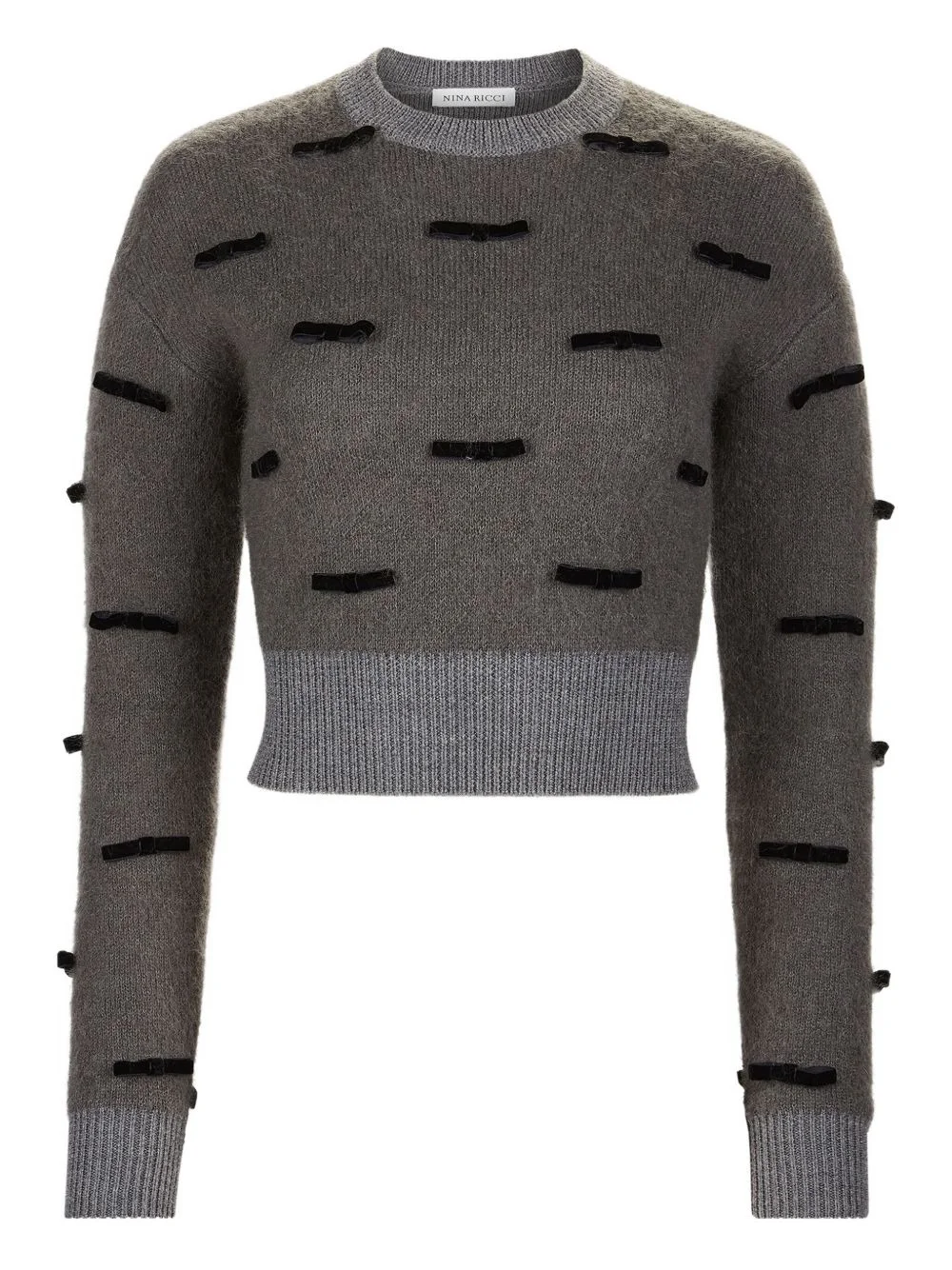 bow-embellished mohair sweater Highlights - Grey - Mohair wool - Black velvet bows - Ribbed hem - Crew neck - Long sleeves Imported Composition Mohair 100% Washing instructions Dry Clean Only