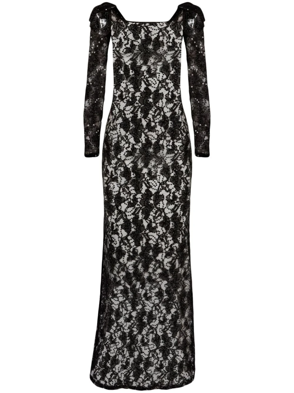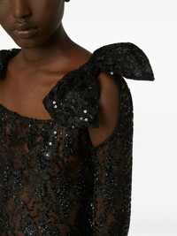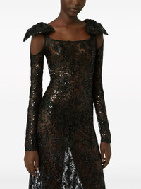 bow-embellished sequinned lace gown Nina Ricci is synonymous with romantic eveningwear, and this black gown is exemplary. Crafted from sheer floral lace to a sleek silhouette, it is illuminated by scores of sequins, evoking a delicate, sparkling look. Meanwhile, two bows at the shoulders add the final touch. Highlights - Black - Floral lace - Sequin embellishment - Oversize bow detail - Sheer - Cold-shoulder design - Square neck - Long sleeves - Maxi - Straight hem Imported Composition Polyamide 80%, Polyethylene 20% SIZE & FIT Measurement SLEEVE LENGTH 27.55 in(70 cm) HIPS 37 in(94 cm) LENGTH 61.41 in(156 cm) WAIST 29.13 in(74 cm) Washing instructions Read Manufacturer Guidelines