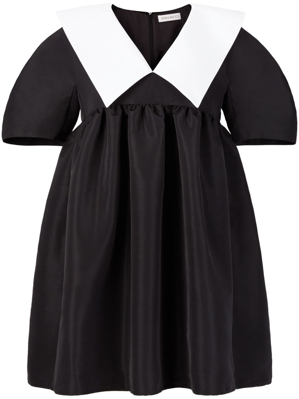 contrasting-collar taffeta babydoll dress Highlights - Black/white - Taffeta - Empire line - Oversized pointed collar - V-neck - Concealed rear zip fastening - Thigh-length - Straight hem Imported Composition Base: Polyester 100% Lining: Viscose 100% SIZE & FIT Measurement HIPS 45.66 in(116 cm) LENGTH 34.64 in(88 cm) WAIST 34.64 in(88 cm)