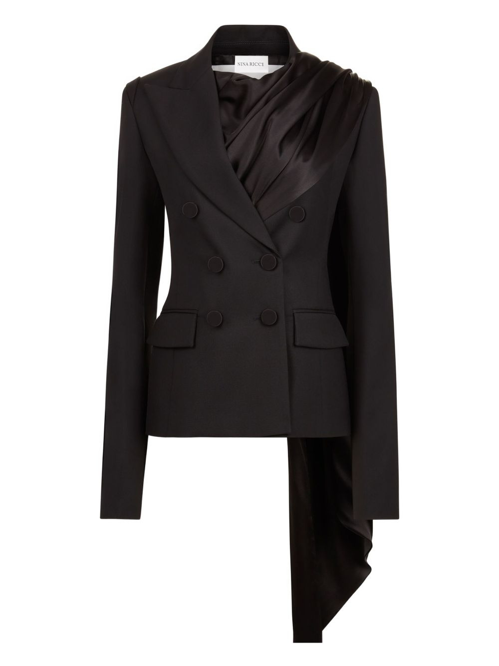 draped-scarf blazer Highlights - Black - Double-breasted button fastening - Draped detailing - Attached scarf - Long sleeves Imported Composition Lining: Viscose 100% Outer: Virgin Wool 100% Washing instructions Dry Clean Only