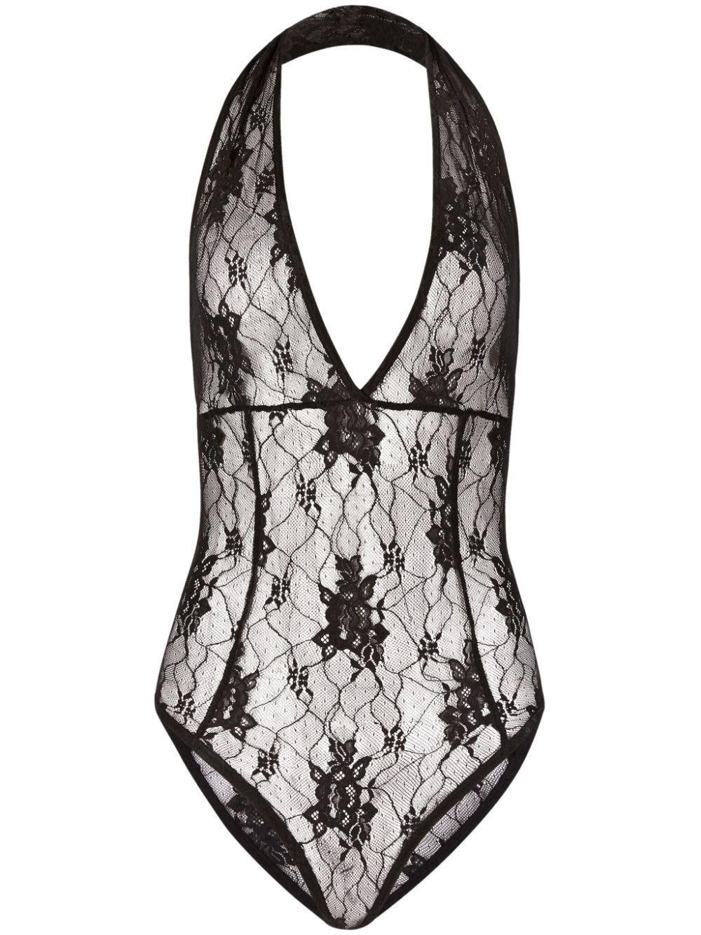 floral-lace halterneck bodysuit Highlights - Jet black - Stretch-design - Semi-sheer construction - Floral lace - Plunging v-neck - Halterneck - Sleeveless - Open back - Just a reminder that this piece must be tried on over your own garments. Imported Composition Base: Polyamide 85%, Elastane 15% Washing instructions Read Manufacturer Guidelines