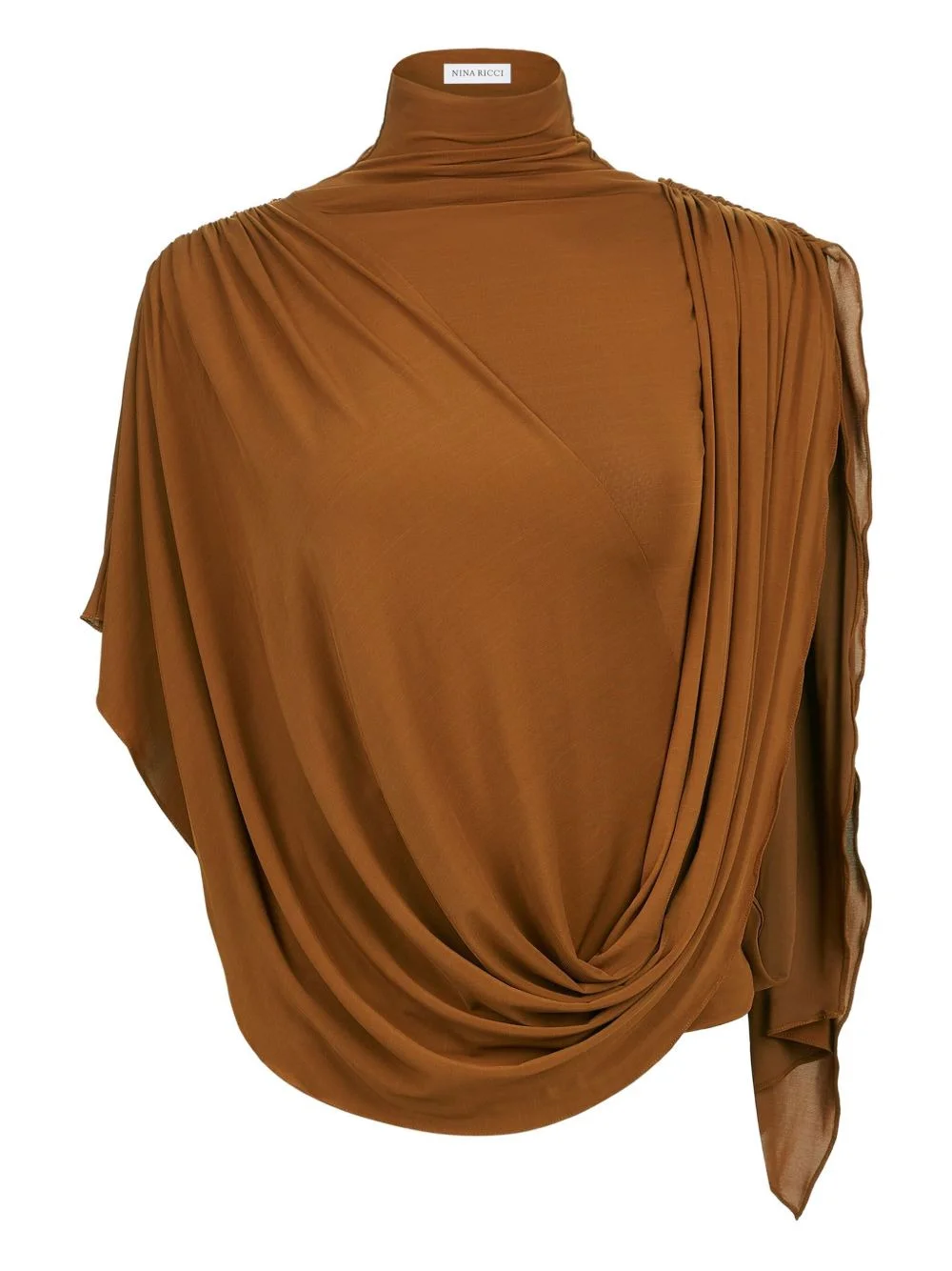 high-neck draped top Highlights - Brown - High neck - Draped design - Short sleeves - Asymmetric hem - Gathered shoulder Imported Composition Viscose 94%, Elastane 6% Washing instructions Read Manufacturer Guidelines
