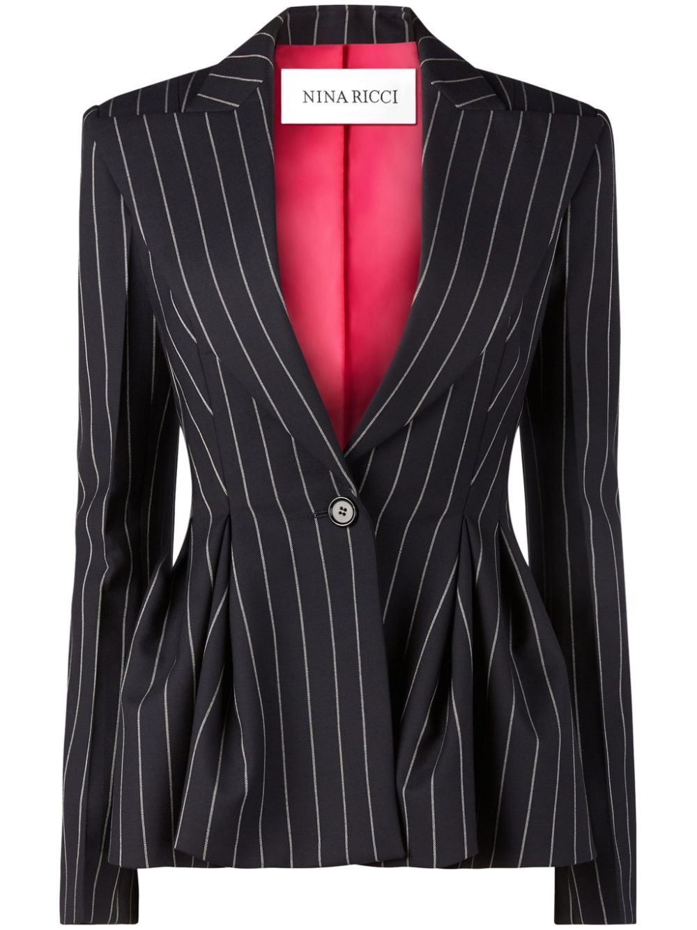pinstripe peplum blazer Highlights - Black/white - Wool blend - Pinstripe pattern - Wide peak lapels - Cinched waist - Button fastening - Peplum hem - Long sleeves Imported Composition Base: Wool 99% Lining: Viscose 100%