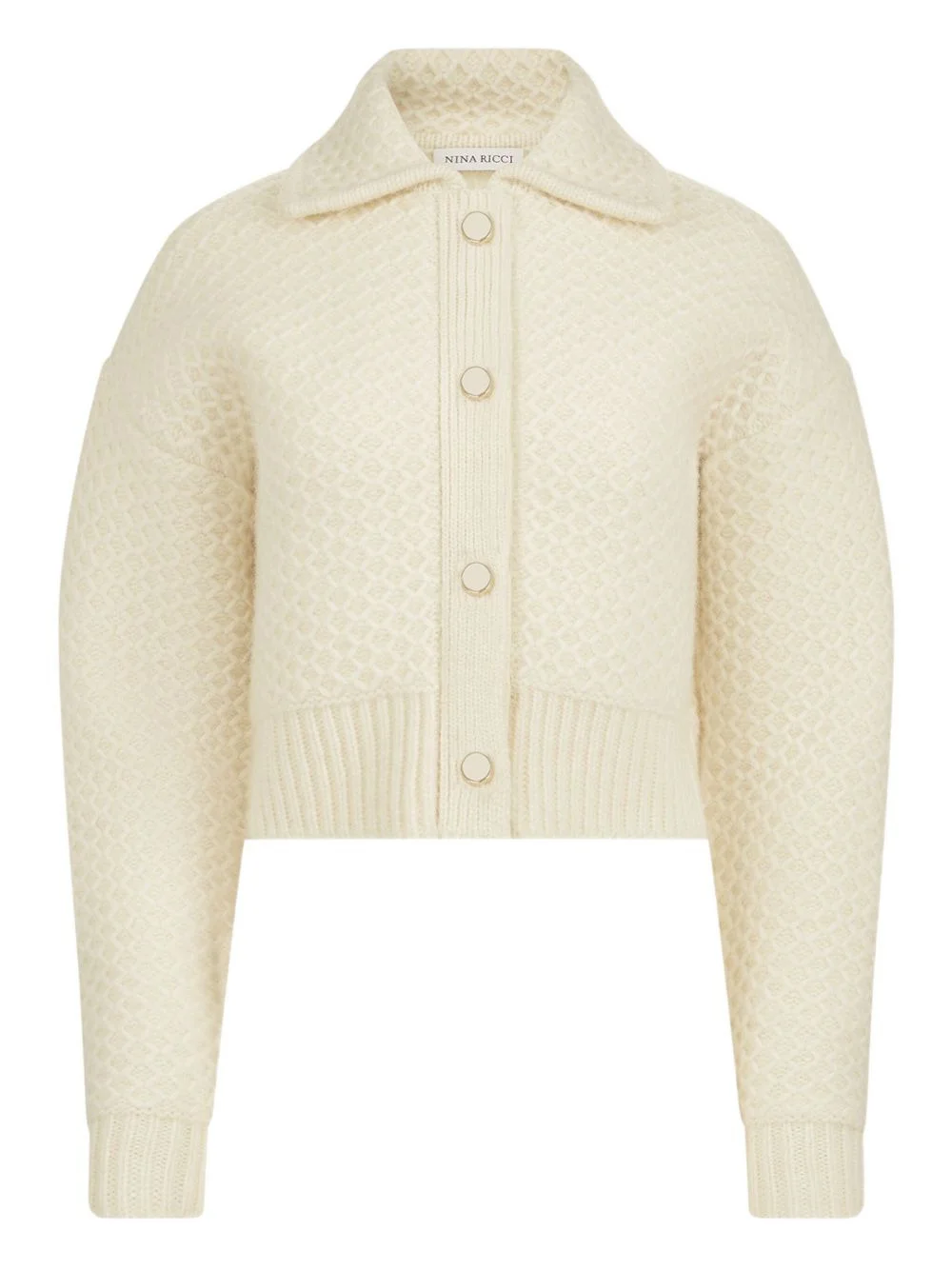 textured-wool cardigan Highlights - Beige - Textured knit - Collared neckline - Button fastening - Cropped length - Long sleeves Imported Composition Wool 73%, Polyamide 27% Washing instructions Read Manufacturer Guidelines