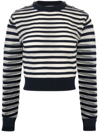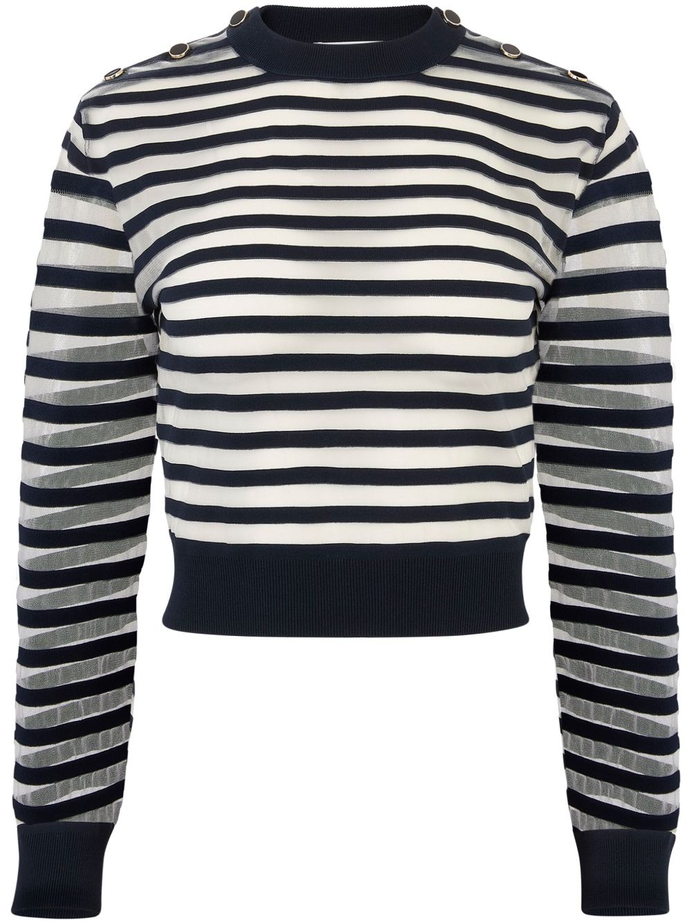 transparent striped sweatshirt Highlights - Transparent/navy blue - Horizontal stripe pattern - Side button fastening - Crew neck - Long sleeves - Ribbed cuffs and hem Imported Composition Viscose 60%, Polyester 30%, Fabric 10%