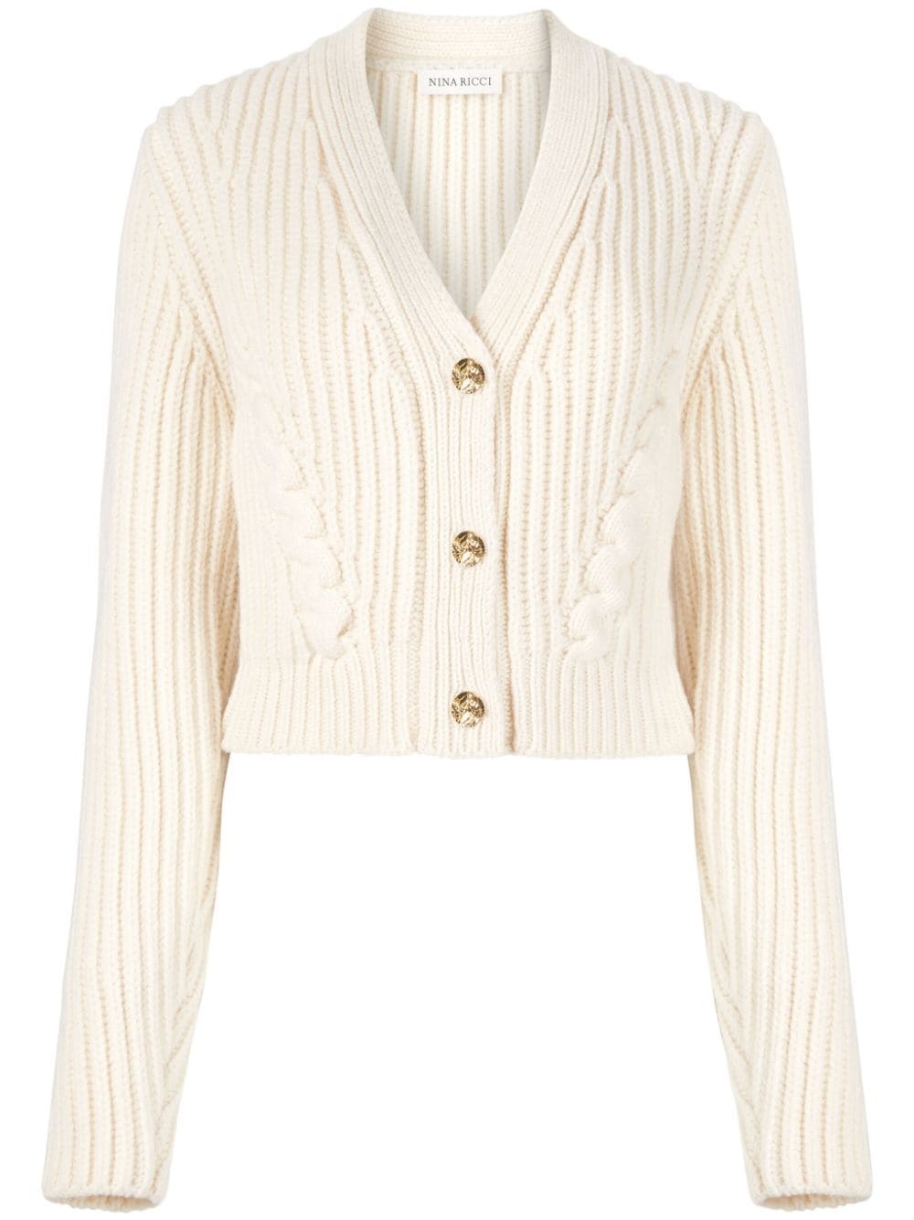 V-neck knit cardigan Highlights - Cream white - Wool-cashmere blend - Chunky knit - Front button fastening - Gold-tone hardware - V-neck Imported Composition Wool 90%, Cashmere 10% Washing instructions Read Manufacturer Guidelines