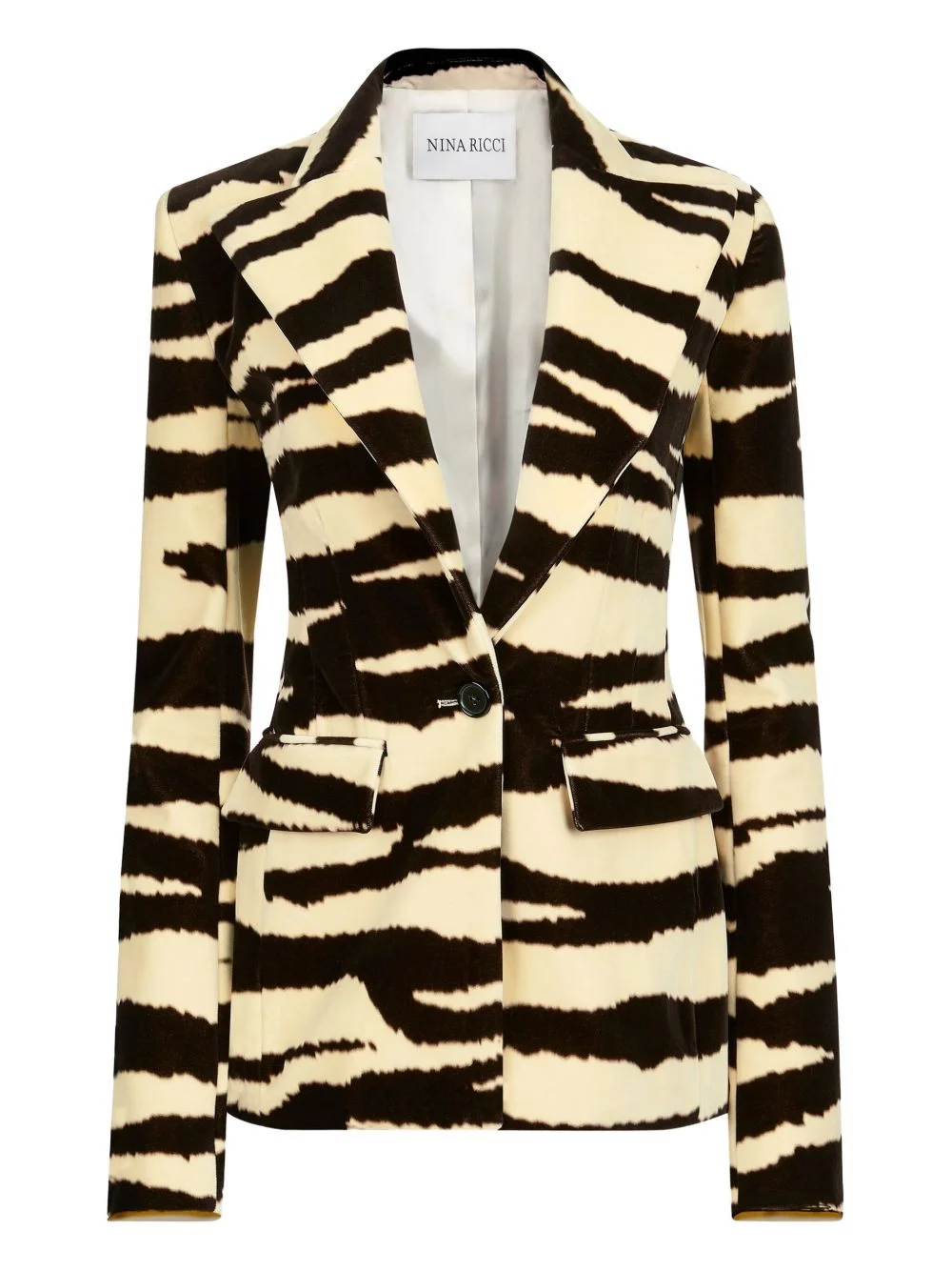 zebra-print blazer Highlights - Brown and beige - Zebra print - Button fastening - Peak lapels - Interchangeable belt (includes 2 shades) Imported Composition Lining: Viscose 100% Outer: Cotton 100% Washing instructions Read Manufacturer Guidelines