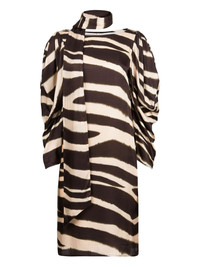 zebra-print midi dress Highlights - Brown and beige - Zebra print - Balloon sleeves - Boat neck - Self-tie neck - Long sleeves Imported Composition Viscose 70%, Silk 30% Washing instructions Read Manufacturer Guidelines