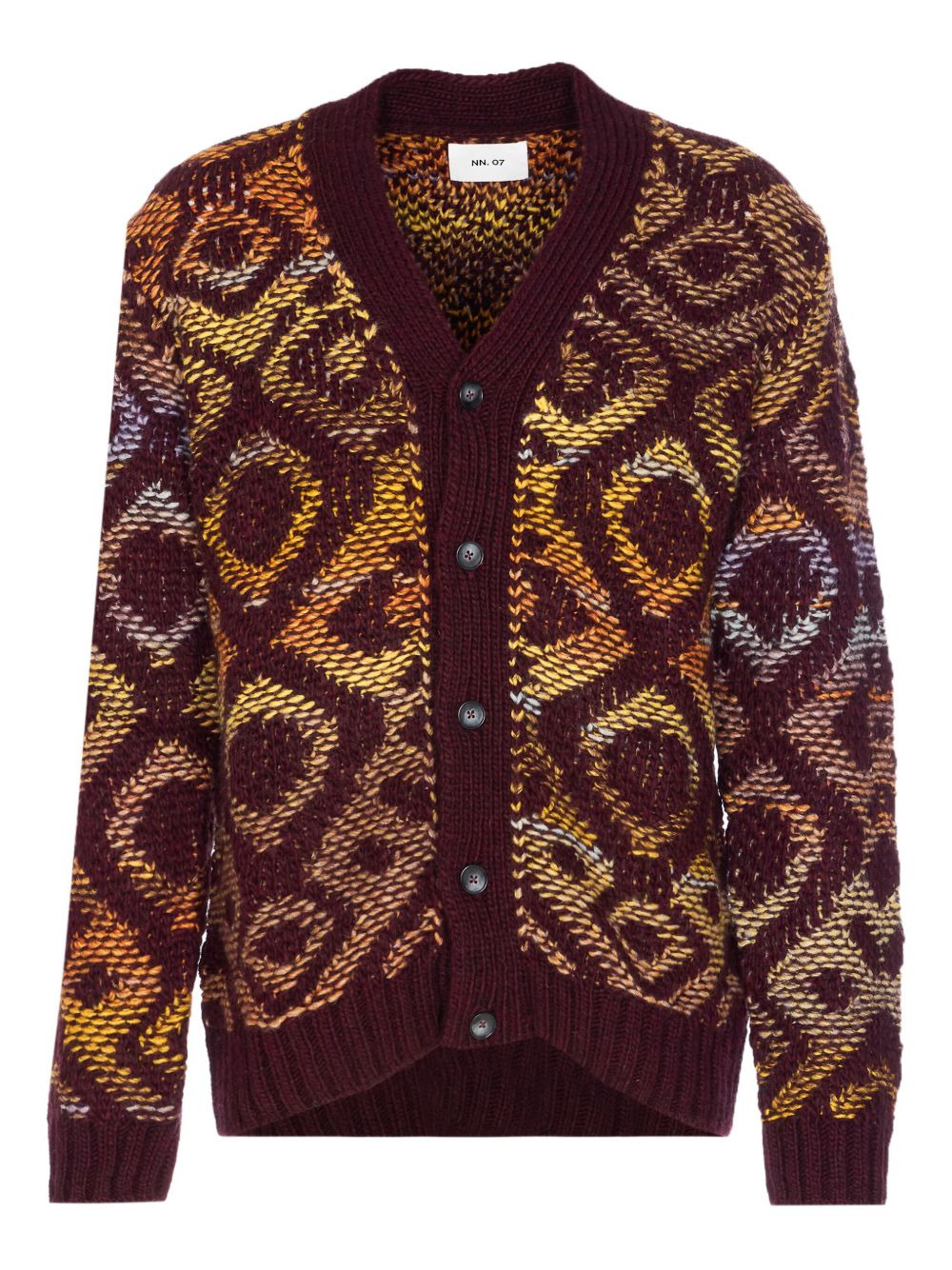 button-front cardigan Highlights - Burgundy - V-neck - Patterned knit - Long sleeves - Button closure Imported Composition Wool 50%, Acrylic 40%, Alpaca 10% Washing instructions Read Manufacturer Guidelines