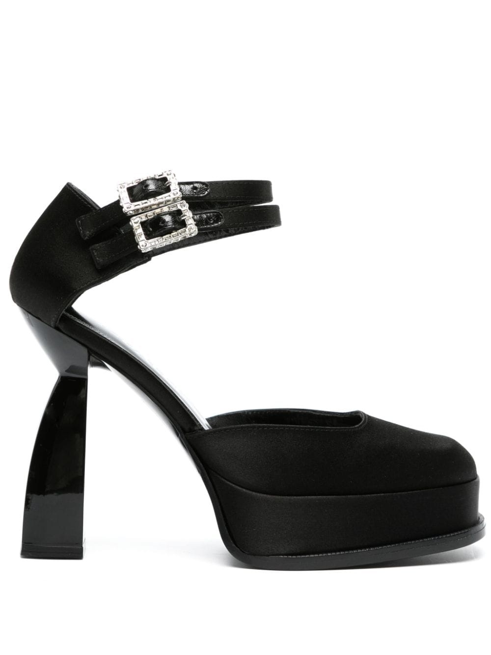 120mm Angel Y satin pumps Highlights - Black - Satin finish - Square toe - Buckle-fastening ankle strap - Crystal buckle detail - Platform sole - Sculpted heel - Branded leather insole Imported Composition Sole: Rubber 100% Outer: Fabric 100% Lining: Calf Leather 100% SIZE & FIT Measurement HEEL 4.72 in(12 cm) PLATFORM 1.37 in(3.5 cm)