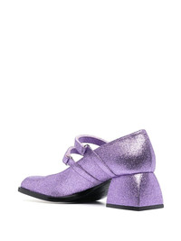Bacara 55mm glitter mary-jane shoes Nodaleto’s eye-catching aesthetic is on full display with the Bacara mary-jane shoes. The pair are set atop a 55mm block heel and presented in a vibrant purple hue that boasts a glittering finish. Made in Italy Composition Other fibres 100% SIZE & FIT Measurement HEEL 2.16 in(5.5 cm)