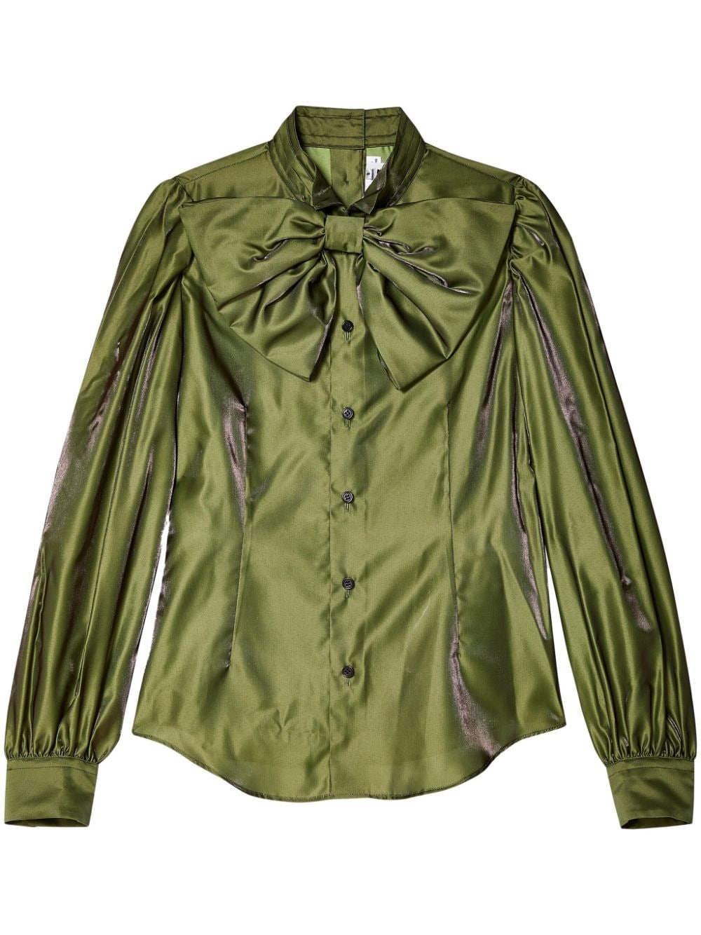 bow detailing blouse Highlights - Olive green - Metallic sheen - Detachable bow - Front button fastening - Band collar - Gathered detailing - Curved hem Imported Composition Polyester 60%, Nylon 40%