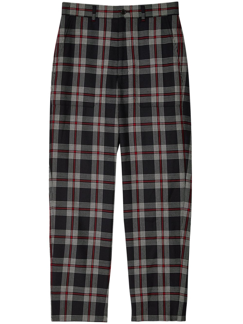 check-print trousers Highlights - Black/red - Wool blend - Check print - Front button and zip fastening - Mid-rise - Belt loops - Two side inset pockets - Two rear patch pockets - Straight leg Imported Composition Wool 51%, Polyester 49%