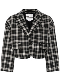 checked cropped blazer black/white wool plaid check pattern front button fastening cinch detailing notched lapels crop sleeves chest welt pocket two front flap pockets internal pocket full lining cropped Imported Composition Outer: Wool 100% Lining: Cupro 100% SIZE & FIT Model measurements Height 5 ft 10 in(1.77 m) Bust/Chest 27.95 in(71 cm) Hips 34.64 in(88 cm) Waist 22.83 in(58 cm) FittingInformation Designed for a boxy fit, intended for a loose fit throughout Made from a padded non-stretch fabric, giving it no natural elasticity