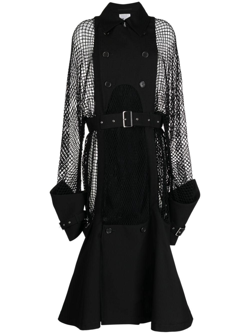 double-breasted belted coat Highlights - Black - Wool blend - Mesh detailing - Double-breasted button fastening - Belted waist - Classic collar - Long sleeves - Mid-length - Flared hem Imported Composition Wool 88%, Mohair 12% SIZE & FIT Model measurements Height 5 ft 10 in(1.79 m) Bust/Chest 31.49 in(80 cm) Hips 34.64 in(88 cm) Waist 22.83 in(58 cm) FittingInformation Designed to be unstructured, offering a loose fit throughout The belt offers adjustability for fitted preferences Made from a heavyweight non-stretch fabric This piece fits true to size – take your usual size Washing instructions Dry Clean Only