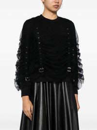 panelled buckled cotton blouse Highlights - Black - Cotton - Semi-sheer panels - Panelled design - Decorative buckle detailing - Ruched detailing - Silver-tone hardware - Crew neck - Single rear button fastening - Long sleeves - Curved hem Imported Composition Cotton 100% SIZE & FIT Model measurements Height 5 ft 10 in(1.77 m) Bust/Chest 31.49 in(80 cm) Hips 35.43 in(90 cm) Waist 25.19 in(64 cm) FittingInformation Designed for a slim fit that sits just away from the body offering a close yet comfortable fit The belt offers adjustability for fitted preferences Made from a midweight non-stretch fabric, this piece offers minimal elasticity when worn This piece fits true to size – take your usual size Washing instructions Dry Clean Only