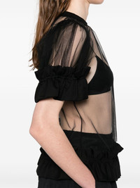 ruffle-detail sheer blouse Highlights - Black - Crew neck - Short sleeves - Ruffle hem Imported Composition Nylon 100%, Cotton 100% SIZE & FIT Model measurements Height 5 ft 10 in(1.79 m) Bust/Chest 35.43 in(90 cm) Hips 35.03 in(89 cm) Waist 25.19 in(64 cm) FittingInformation Designed to be unstructured, offering a loose fit throughout Made from a lightweight non-stretch fabric, this piece offers minimal elasticity when worn