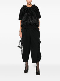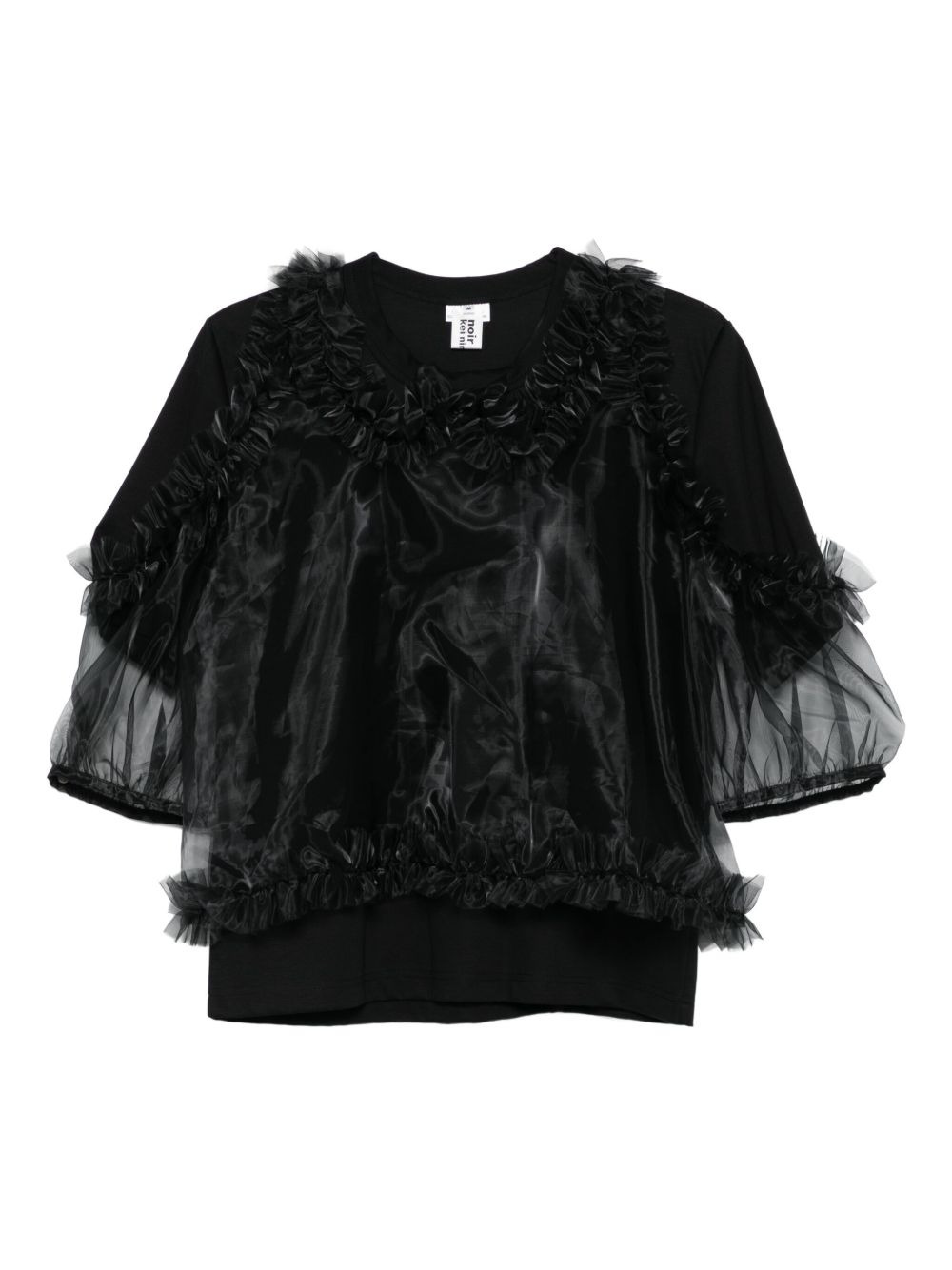 ruffled overlay top Highlights - Black - Sheer overlay - Ruffled trim - Short sleeves - Round neck Imported Composition Cotton 100%, Polyester 100% SIZE & FIT Model measurements Height 5 ft 9 in(1.76 m) Bust/Chest 31.49 in(80 cm) Hips 35.03 in(89 cm) Waist 24.8 in(63 cm) Washing instructions Read Manufacturer Guidelines