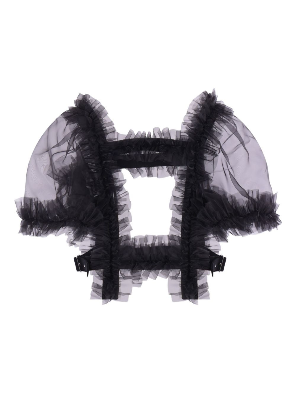 ruffled top Highlights - Black - Ruffle trim - Wool attachments - Buckle fastening Imported Composition Polyester 100%, Wool 100% Washing instructions Read Manufacturer Guidelines