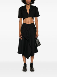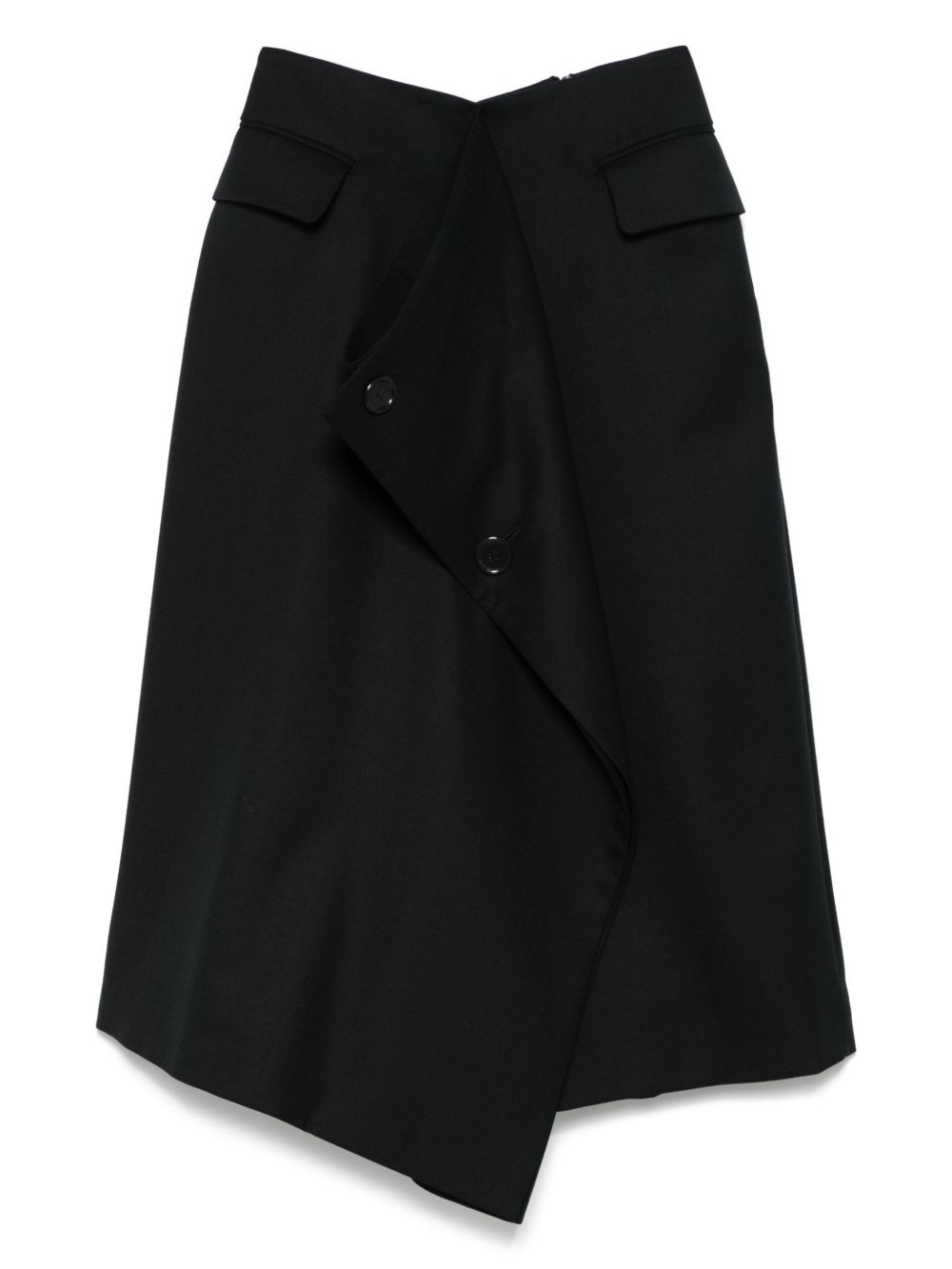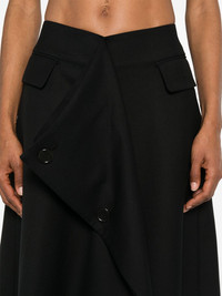 wool midi skirt Highlights - Black - Concealed side hook and zip fastening - Front flap pocket - Rear flap pocket - Draped panel detail Imported Composition Outer: Wool 100% Lining: Cupro 100% SIZE & FIT Model measurements Height 5 ft 11 in(1.8 m) Bust/Chest 32.67 in(83 cm) Hips 35.82 in(91 cm) Waist 25.98 in(66 cm) FittingInformation Designed with an asymmetric hem, this skirt is intended to be worn just below the waist Made from a midweight non-stretch fabric