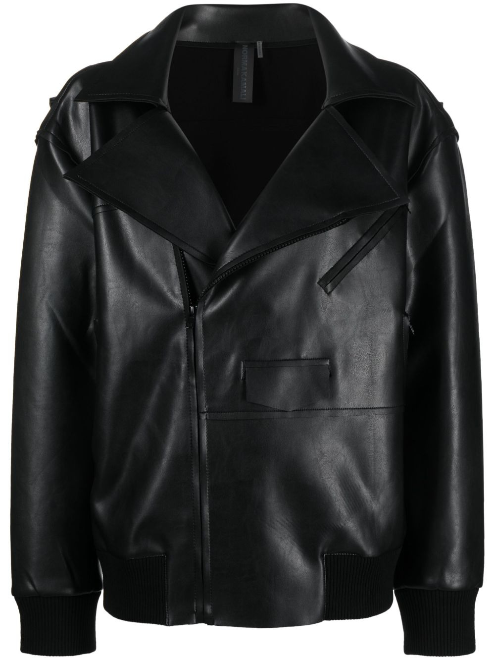 faux leather zip-up biker jacket Highlights - Black - Faux leather - Panelled design - Notched collar - Off-centre front zip fastening - Long sleeves - Cuff zips - Jetted chest pocket - Ribbed cuffs and hem Imported Composition Outer: Polyurethane 100% Lining: Polyester 90%, Spandex/Elastane 10% SIZE & FIT Model measurements Height 5 ft 10 in(1.78 m) Bust/Chest 31.49 in(80 cm) Hips 36.22 in(92 cm) Waist 25.59 in(65 cm) FittingInformation Designed to be unstructured, offering a loose fit throughout The ribbed hem offers a close, comfortable fit Made from a midweight stretch fabric, this piece offers elasticity and flexibility when worn This piece fits true to size – take your usual size Measurement SLEEVE LENGTH 24.01 in(61 cm) LENGTH 25.51 in(64.8 cm) WAIST 40.98 in(104.1 cm) BUST 47.99 in(121.9 cm) Washing instructions Machine Wash