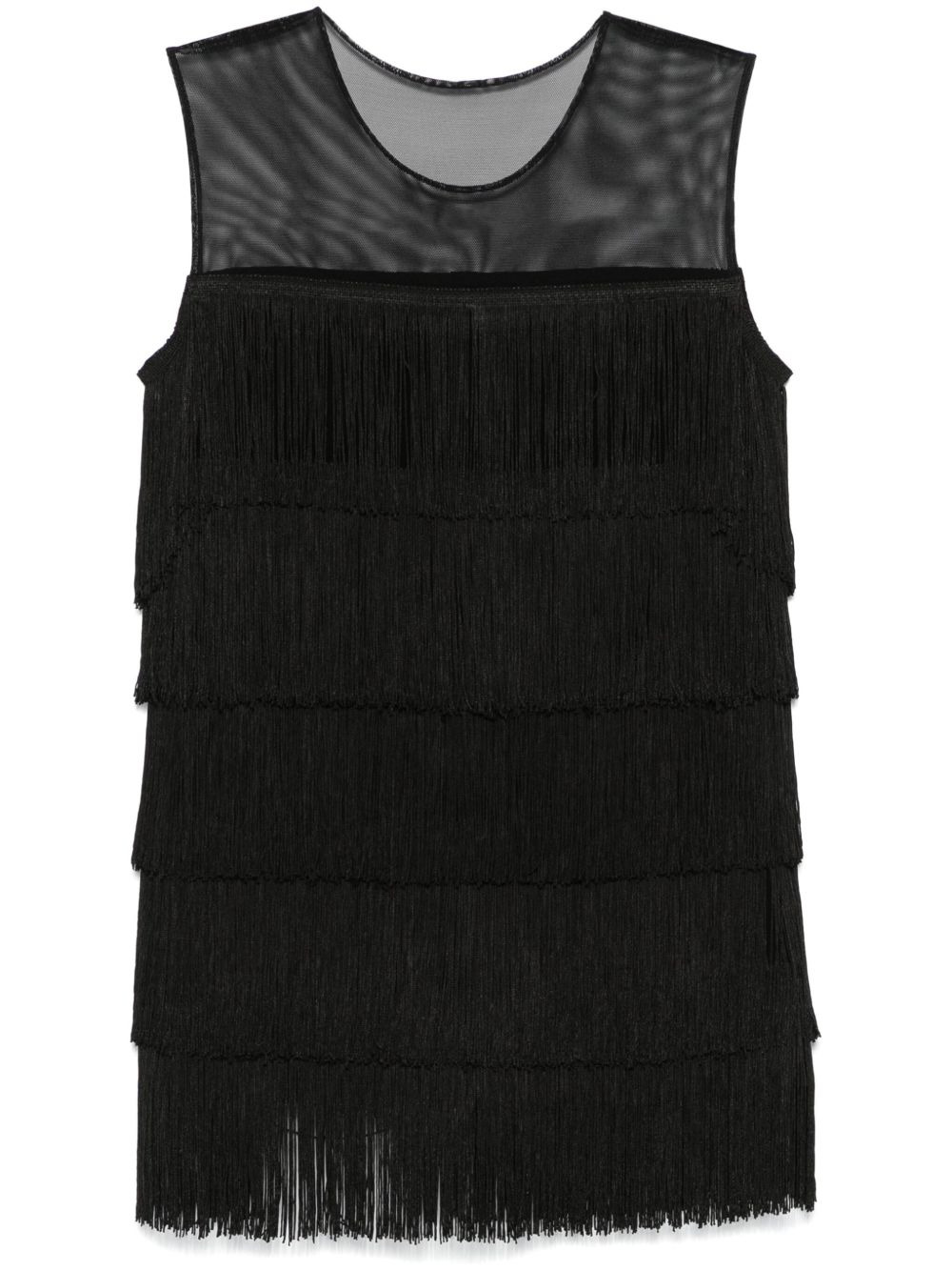 fringed sleeveless mini dress Highlights - Black - Jersey texture - Fringe detailing - Sleeveless - Crew neck - Mesh panelling - Unlined - Straight hem - Thigh-length Imported Composition Outer: Polyester 95%, Spandex/Elastane 5% SIZE & FIT Model measurements Height 5 ft 10 in(1.77 m) Bust/Chest 33.07 in(84 cm) Hips 37 in(94 cm) Waist 24.8 in(63 cm) FittingInformation Designed for a slim fit that sits just away from the body offering a close yet comfortable fit Slightly short in length; consider your own measurements Made from a midweight stretch fabric, this piece offers elasticity and flexibility when worn Washing instructions Do Not Wash/Do Not Dry Clean