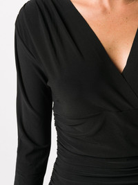 gathered wrap-front jumpsuit Highlights - Black - V-neck - Long sleeves - Stretch-fit - Concealed rear fastening - Wide leg Imported Composition Polyester 95%, Spandex/Elastane 5% SIZE & FIT Model measurements Height 5 ft 9 in(1.74 m) Bust/Chest 32.28 in(82 cm) Hips 35.82 in(91 cm) Waist 24.01 in(61 cm) FittingInformation This piece fits true to size. We recommend you get your regular size Designed for a close fit at the bust, waist and hips Made with a mid-weight stretch fabric Washing instructions Hand Wash